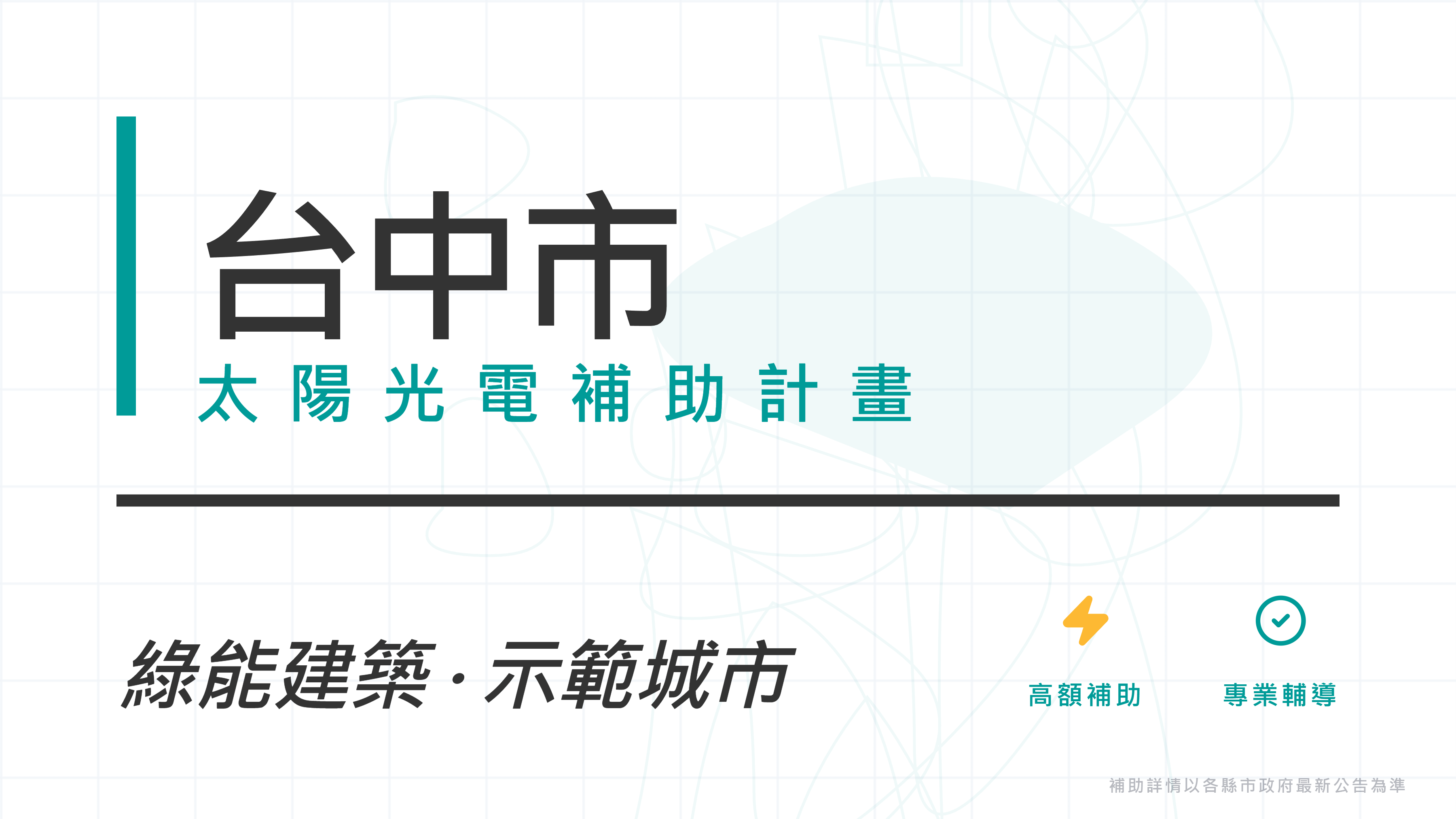 A: 台中市114年度補助計畫,每峰瓩(kWp)補助 3,000 元,每案最高可領 30 萬元。總預算 7,200 萬元。